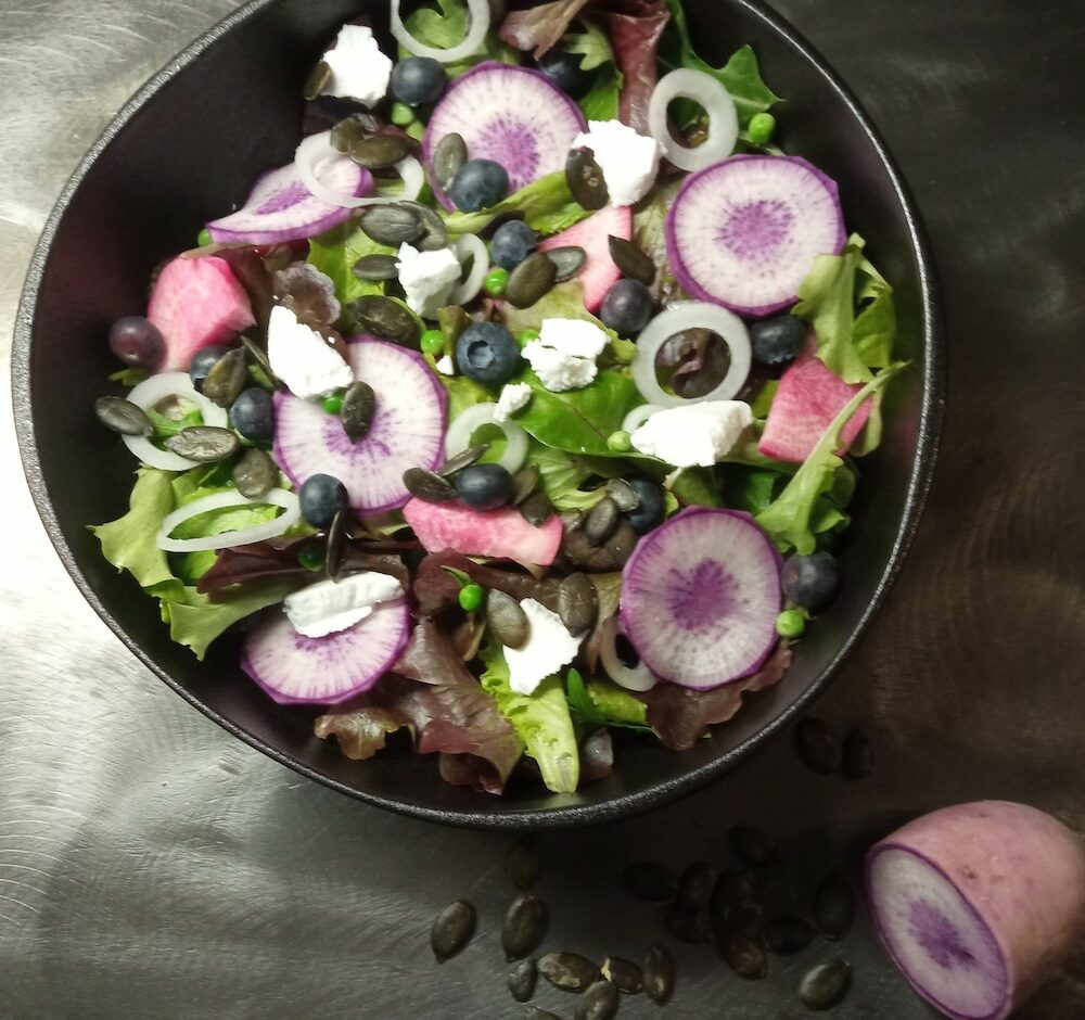 - 2Dans un saladier, disposer le mesclun, les rondelles de radis, l’oignon nouveau ciselé, les petit-pois frais écossés, les myrtilles, quelques morceaux de chèvre frais et des graines de courge.